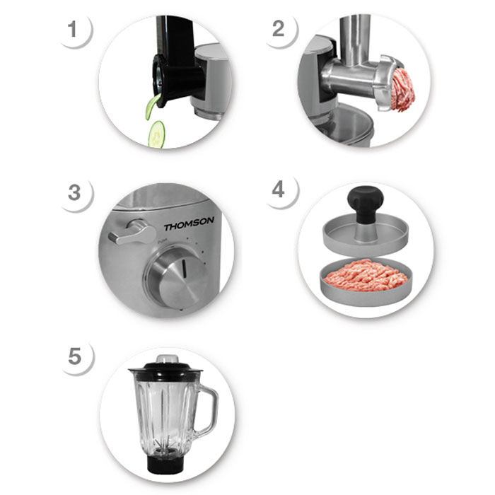 - Συμπεριλαμβάνονται αξεσουάρ για κοπή κιμά, ζυμαρικών, παρασκευή λουκάνικων, κώνους κοπής λαχανικών, καλούπι για μπιφτέκια
