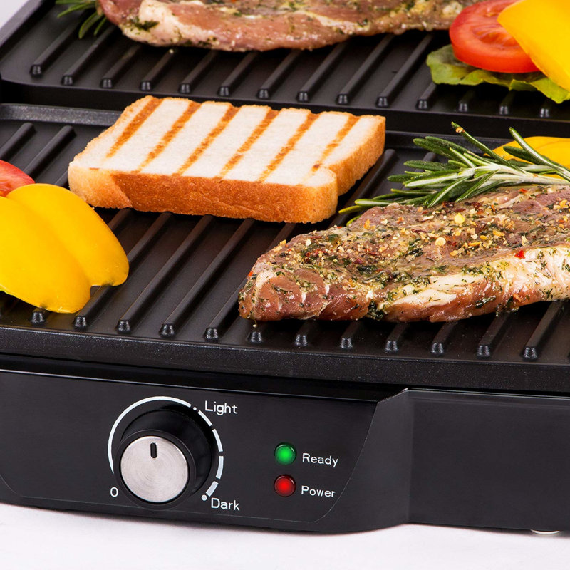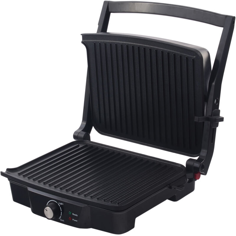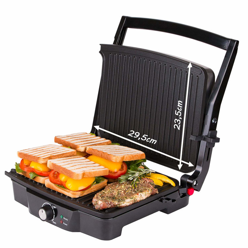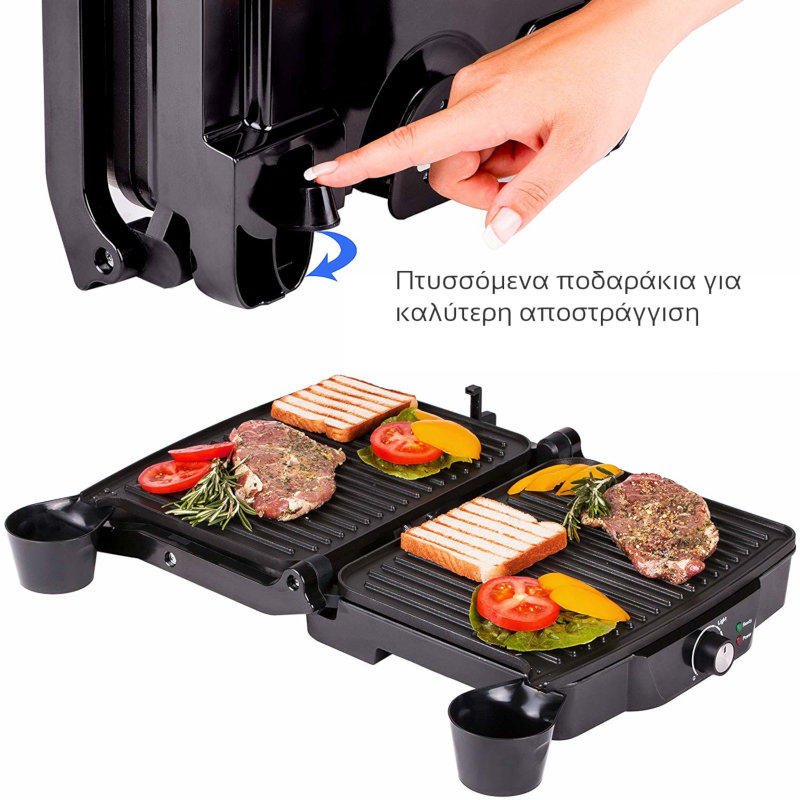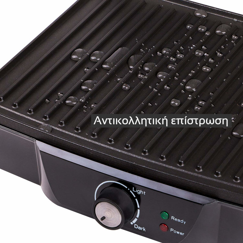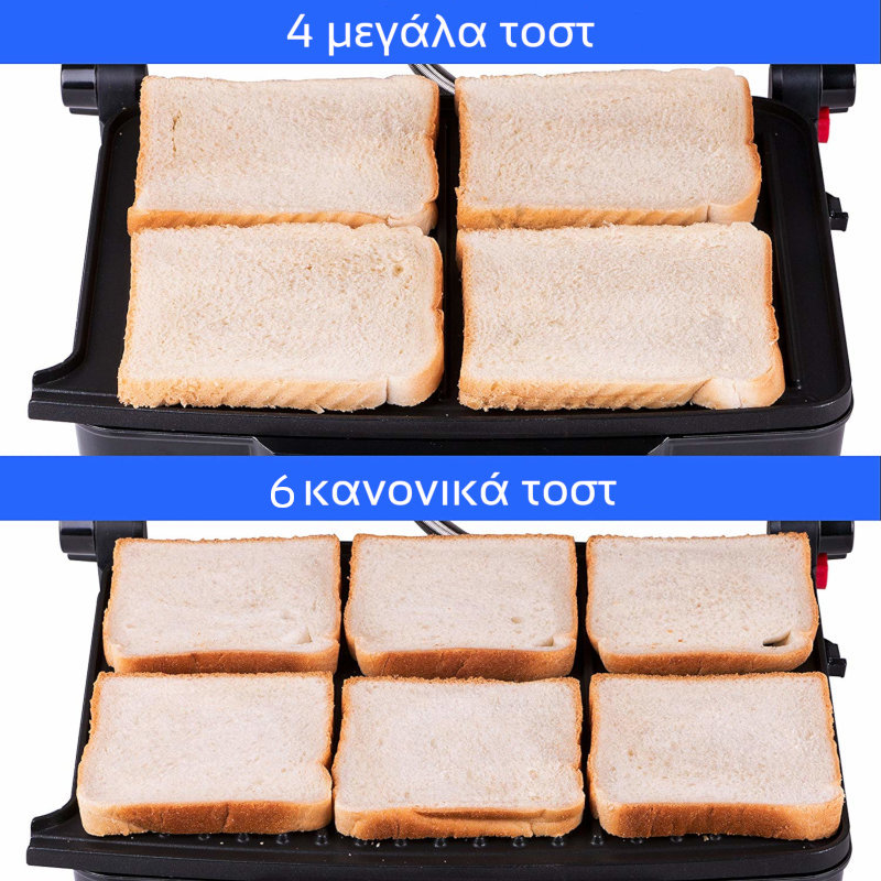 Τοστιέρα - grill με θερμοστάτη και αντικολλητικες πλάκες και 2 δοχεία για απομάκρυνση του λίπους. Η γκριλιέρα διαθέτει ισχύ 2000W και οι αντικολλητικές πλάκες κάνουν το καθάρισμα εύκολο, και το μαγείρεμα υγιεινό μιας και δεν χρειάζεται λάδι. Ψήνει σε 3 θέσεις, 180ο, 90ο, με τις πλάκες παράλληλες ή υπό γωνία που προσαρμόζεται στο τρόφιμο που ψήνετε, ώστε να μπορεί να χρησιμοποιηθεί σαν ψηστιέρα και σας τοστιέρα. Ζεσταίνεται πολύ γρήγορα και διαχέει ομοιόμορφα τη θερμοκρασία για άψογο ψήσιμο κάθε φορά. Οι πλάκες ψησίματος έχουν διαστάσεις 29.5 cm x 23.5 cm, αρκετές για 4 μεγάλα τοστ ή 6 κανονικού μεγέθους.