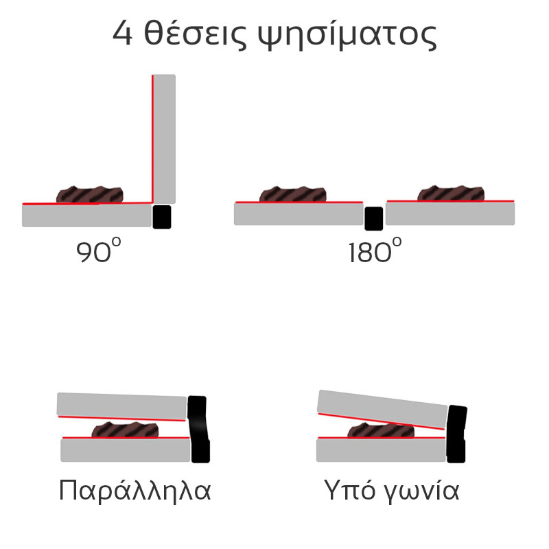 - Ψήνει με τις πλάκες παράλληλα ή υπό γωνία προσαρμοσμένες στο τρόφιμο