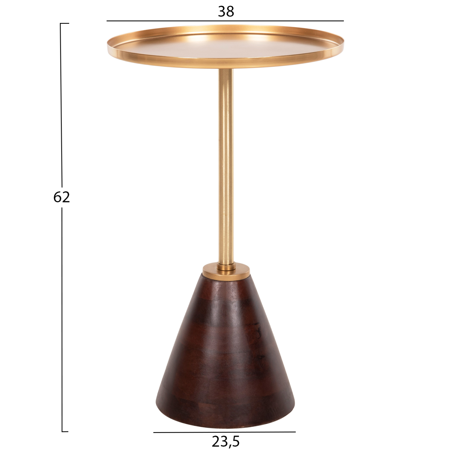 Το βοηθητικό τραπεζάκι KAPPUR σίγουρα θα τραβήξει τα βλέμματα και δικαιολογημένα. Διαθέτει κωνική βάση από πολυτελές ξύλο MANGO σε ελκυστικό ΚΑΡΥΔΙ χρώμα, η οποία συνδέεται με την ΧΡΥΣΗ μεταλλική στρογγυλή επιφάνεια με μια λεπτή μεταλλική κολώνα που προσδίδει αξεπέραστη κομψότητα στο σύνολο. Ιδανικό τόσο για το σπίτι, όσο και για επαγγελματικούς χώρους.
