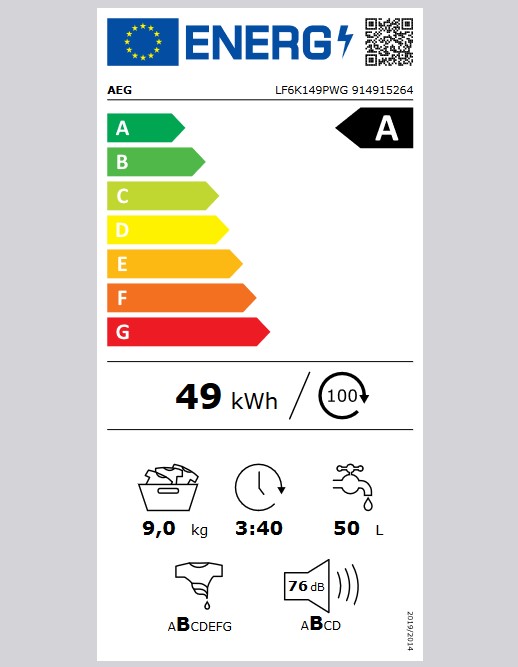 Σταθμισμένη κατανάλωση ενέργειας σε kWh ανά 100 κύκλους πλύσης του προγράμματος eco 40-60 (ΕΕ 2017/1369): 49