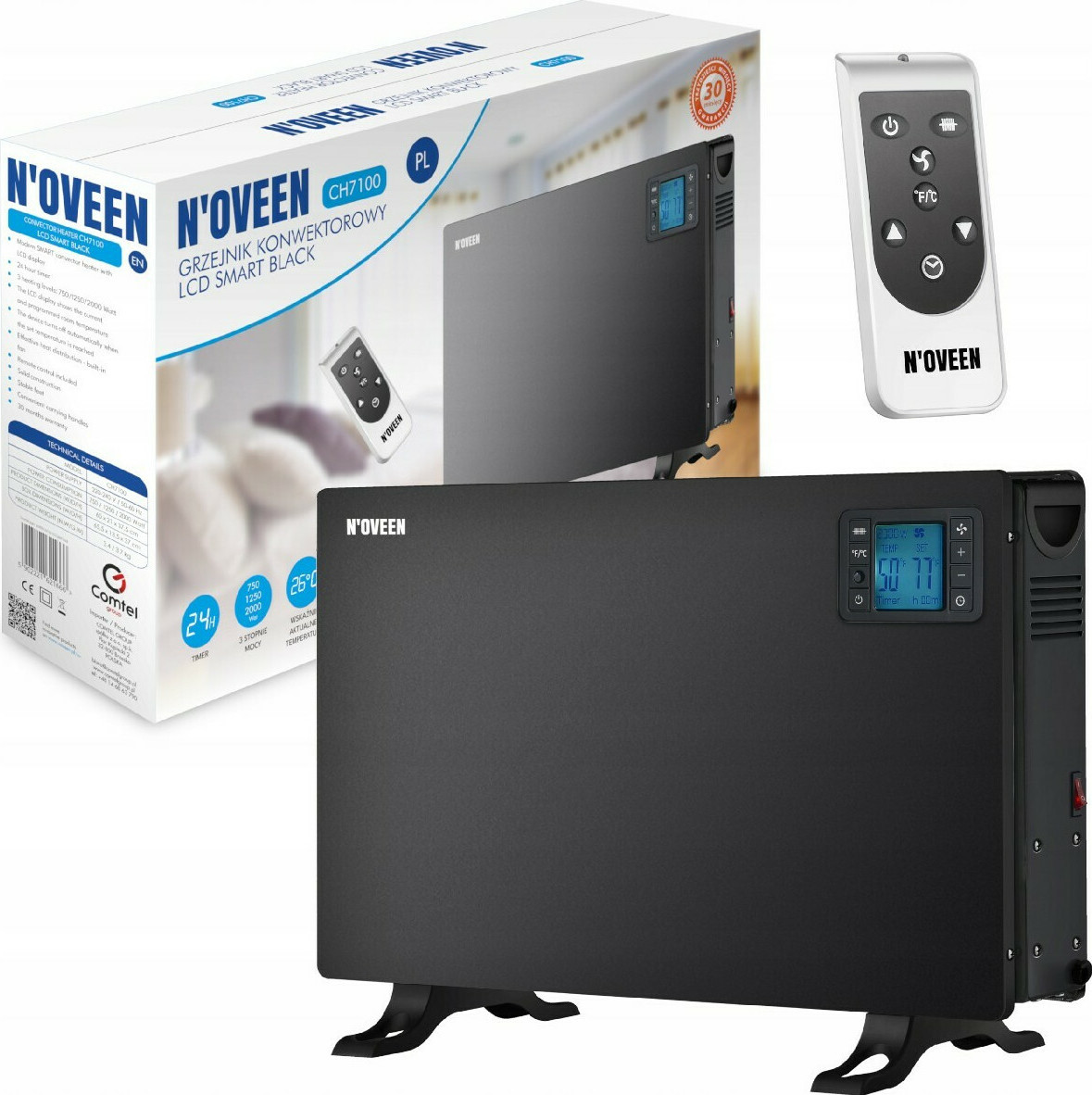 Ο θερμοπομπός N'oveen CH7100 LCD SMART Black έχει σχεδιαστεί για να ταιριάζει σε κάθε τύπο δωματίου. Διαθέτει οθόνη LCD που δείχνει την τρέχουσα και προγραμματισμένη θερμοκρασία, επιτρέποντας ακριβή έλεγχο του κλίματος του χώρου σας. Η συσκευή προσφέρει τρία επίπεδα ισχύος (750W, 1250W, 2000W), δίνοντάς σας τη δυνατότητα να προσαρμόσετε τη θέρμανση ανάλογα με τις ανάγκες σας. Ο ενσωματωμένος ανεμιστήρας εξασφαλίζει ομοιόμορφη κατανομή της θερμότητας, ενώ ο χρονοδιακόπτης 24 ωρών επιτρέπει τον προγραμματισμό της λειτουργίας του θερμοπομπού σύμφωνα με το καθημερινό σας πρόγραμμα. Το τηλεχειριστήριο που περιλαμβάνεται διευκολύνει τη ρύθμιση από απόσταση, προσφέροντας επιπλέον άνεση.